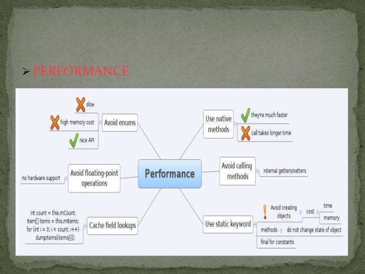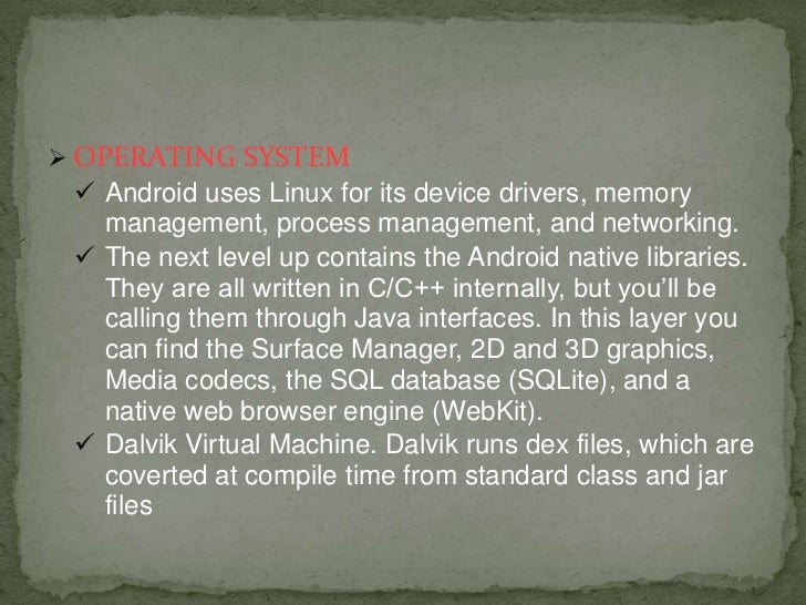 - 6. OPERATING SYSTEM Android uses Linux for its device drivers, memory management, process management, and networking. The next level up contains the Android native libraries. They are all written in C/C++ internally, but you’ll be calling them through Java interfaces. In this layer you can find the Surface Manager, 2D and 3D graphics, Media codecs, the SQL database (SQLite), and a native web browser engine (WebKit). Dalvik Virtual Machine. Dalvik runs dex files, which are coverted at compile time from standard class and jar files