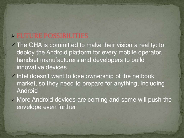 - 10. FUTURE POSSIBILITIES The OHA is committed to make their vision a reality: to deploy the Android platform for every mobile operator, handset manufacturers and developers to build innovative devices Intel doesn’t want to lose ownership of the netbook market, so they need to prepare for anything, including Android More Android devices are coming and some will push the envelope even further