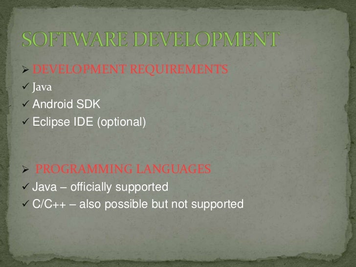 - 11. DEVELOPMENT REQUIREMENTS Java Android SDK Eclipse IDE (optional) PROGRAMMING LANGUAGES Java – officially supported C/C++ – also possible but not supported
