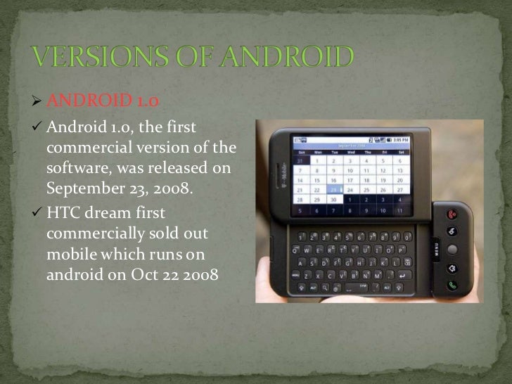 - 12. ANDROID 1.0 Android 1.0, the first commercial version of the software, was released on September 23, 2008. HTC dream first commercially sold out mobile which runs on android on Oct 22 2008