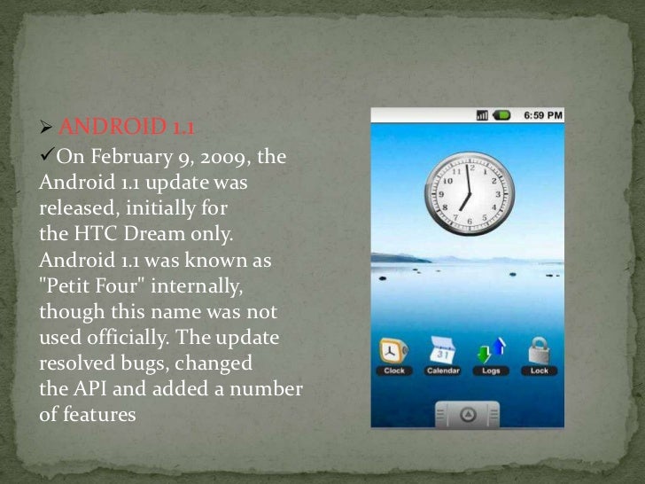 - 13. ANDROID 1.1On February 9, 2009, theAndroid 1.1 update wasreleased, initially forthe HTC Dream only.Android 1.1 was known as"Petit Four" internally,though this name was notused officially. The updateresolved bugs, changedthe API and added a numberof features