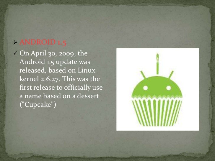 - 14. ANDROID 1.5 On April 30, 2009, the Android 1.5 update was released, based on Linux kernel 2.6.27. This was the first release to officially use a name based on a dessert ("Cupcake")