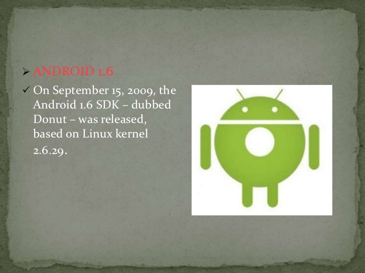 - 15. ANDROID 1.6 On September 15, 2009, the Android 1.6 SDK – dubbed Donut – was released, based on Linux kernel 2.6.29.