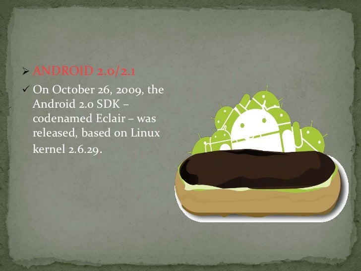 - 16. ANDROID 2.0/2.1 On October 26, 2009, the Android 2.0 SDK – codenamed Eclair – was released, based on Linux kernel 2.6.29.