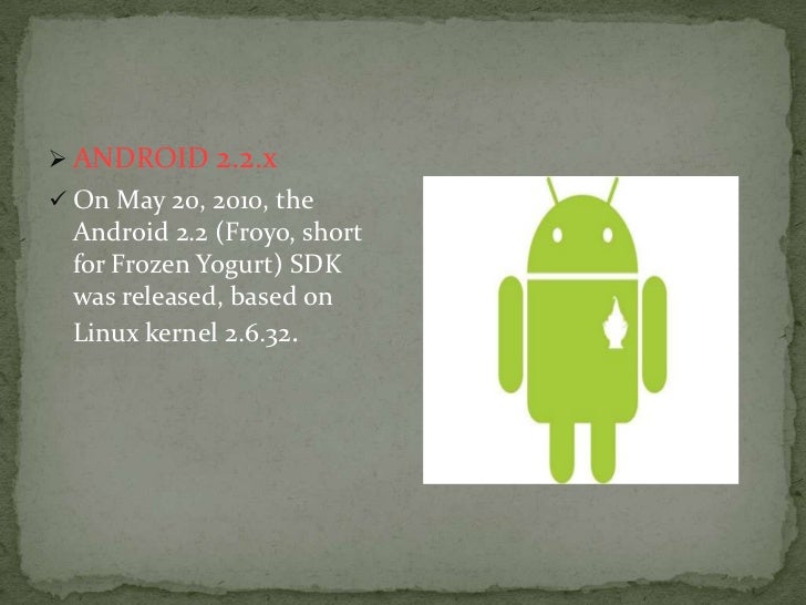 - 17. ANDROID 2.2.x On May 20, 2010, the Android 2.2 (Froyo, short for Frozen Yogurt) SDK was released, based on Linux kernel 2.6.32.