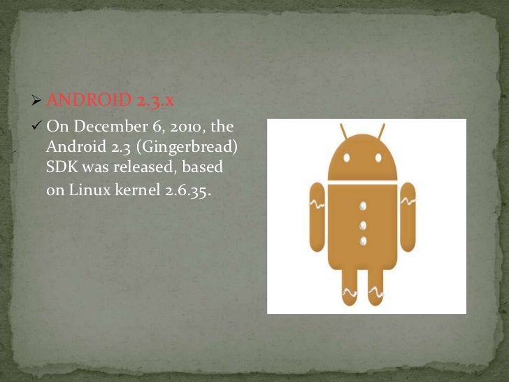 - 18. ANDROID 2.3.x On December 6, 2010, the Android 2.3 (Gingerbread) SDK was released, based on Linux kernel 2.6.35.