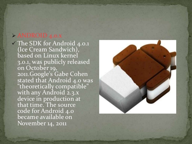 - 20. ANDROID 4.0.x The SDK for Android 4.0.1 (Ice Cream Sandwich), based on Linux kernel 3.0.1, was publicly released on October 19, 2011.Googles Gabe Cohen stated that Android 4.0 was "theoretically compatible" with any Android 2.3.x device in production at that time. The source code for Android 4.0 became available on November 14, 2011