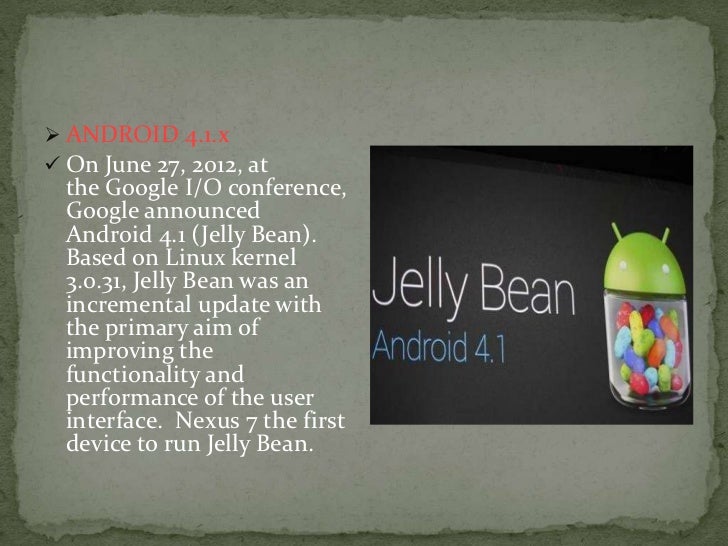 - 21. ANDROID 4.1.x On June 27, 2012, at the Google I/O conference, Google announced Android 4.1 (Jelly Bean). Based on Linux kernel 3.0.31, Jelly Bean was an incremental update with the primary aim of improving the functionality and performance of the user interface. Nexus 7 the first device to run Jelly Bean.