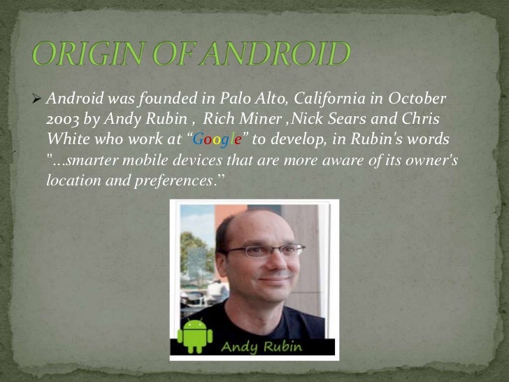 - 3. Android was founded in Palo Alto, California in October 2003 by Andy Rubin , Rich Miner ,Nick Sears and Chris White who work at “Google” to develop, in Rubins words "...smarter mobile devices that are more aware of its owners location and preferences.”