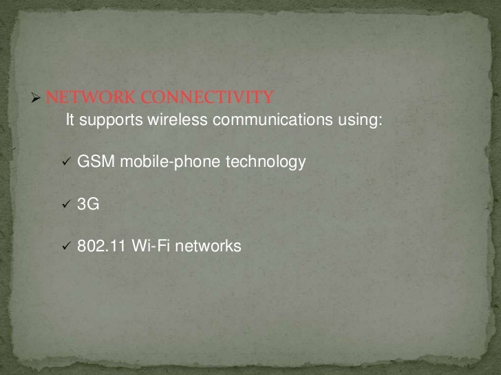 - 7. NETWORK CONNECTIVITY It supports wireless communications using: GSM mobile-phone technology 3G 802.11 Wi-Fi networks