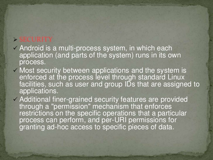 - 8. SECURITY Android is a multi-process system, in which each application (and parts of the system) runs in its own process. Most security between applications and the system is enforced at the process level through standard Linux facilities, such as user and group IDs that are assigned to applications. Additional finer-grained security features are provided through a "permission" mechanism that enforces restrictions on the specific operations that a particular process can perform, and per-URI permissions for granting ad-hoc access to specific pieces of data.
